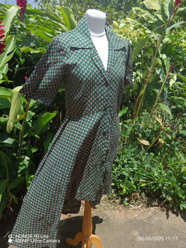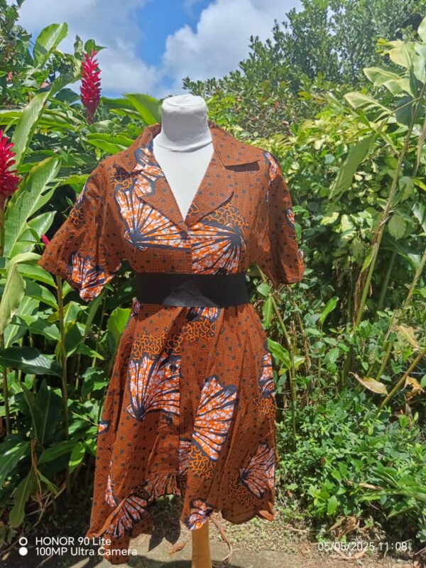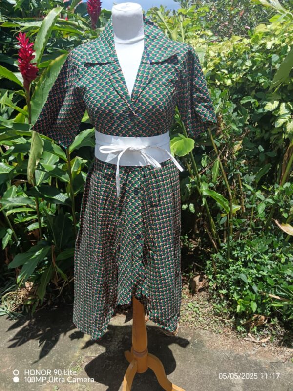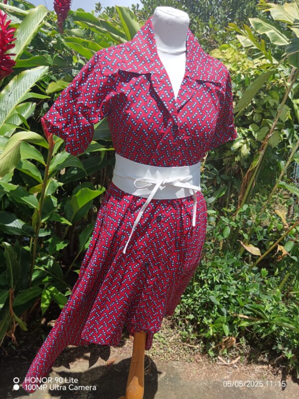 Cette robe se démarque par sa coupe asymétrique unique : plus courte sur le devant et plus longue à l’arrière, offrant un tombé fluide et dynamique. Son col chemisier et sa taille ajustée soulignent la silhouette tout en apportant une touche sophistiquée.