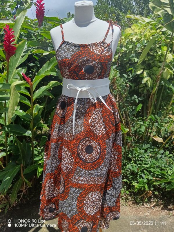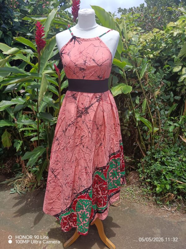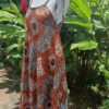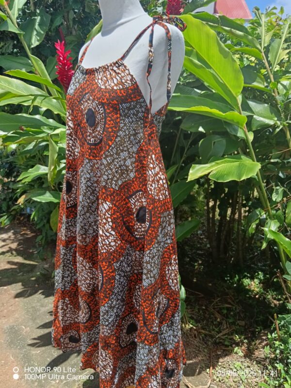 Cette robe longue séduit par sa coupe fluide et aérienne, offrant un confort optimal et une liberté de mouvement appréciable en été. Ses fines bretelles apportent une touche féminine et élégante, tandis que son tissu imprimé coloré et unique donne du caractère à la tenue.