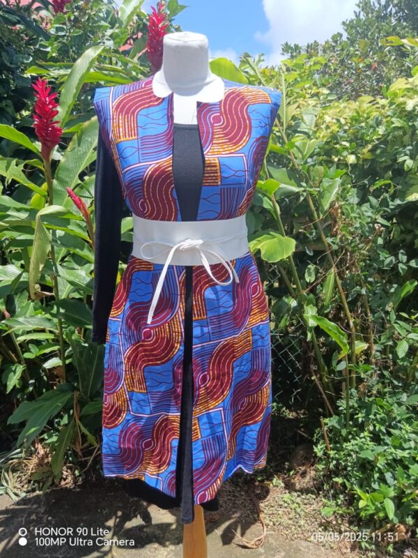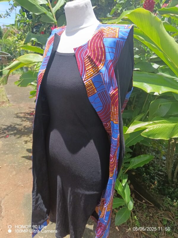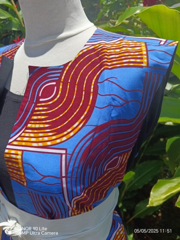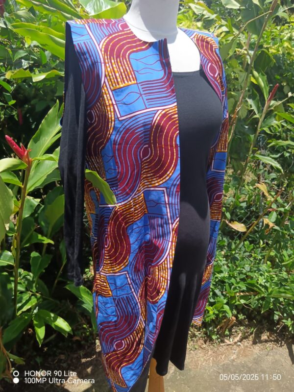 Cette veste sans manches allie style moderne et authenticité grâce à son tissu wax aux motifs géométriques et colorés. Sa coupe droite et ouverte sur l’avant permet de la superposer facilement sur une robe, un t-shirt ou un chemisier.